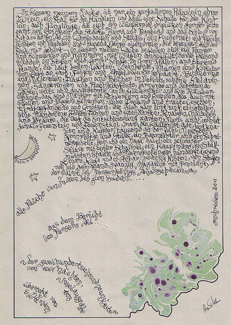 Die große Frühlingsrolle 2010 ist ein 12 Meter langes Papierband, vereinigt 45 Gedichte aus 2000 Jahren, mit grünen Tinten in verschiedenen Schriften handgeschrieben und mit Illustrationen versehen, die die Epochen von Klassik bis zur Moderne verbinden. Gedacht zur Präsentation bei Messen und Veranstaltungen, Ausstellungen in Bibliotheken und anderen Kultureinrichtungen und als optischer Anreiz bei Lesungen und anderen Darbietungen. Der Platzbedarf ist gering, wenn sie wie eine Thorarolle ausgelegt wird. Sie ist fragil und sollte beaufsichtigt werden, egal ob ein-oder ausgerollt.